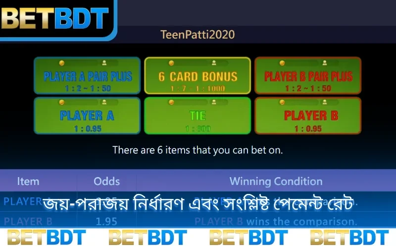 Teen Patti 20-20 ব্যবহারকারীদের আকর্ষণ করার অন্যতম কারণ হলো এর “6 Card Bonus” বা ৬-কার্ড বোনাস সাইড বেট। এটি বিনিয়োগের সবচেয়ে আকর্ষণীয় মাধ্যম হিসেবে বিবেচিত কারণ এর পে-আউট বা পুরস্কারের হার অত্যন্ত বেশি। সিস্টেম এখানে Player A এবং Player B কে দেওয়া মোট ৬টি কার্ড মিলিয়ে দেখে যে কোনো
