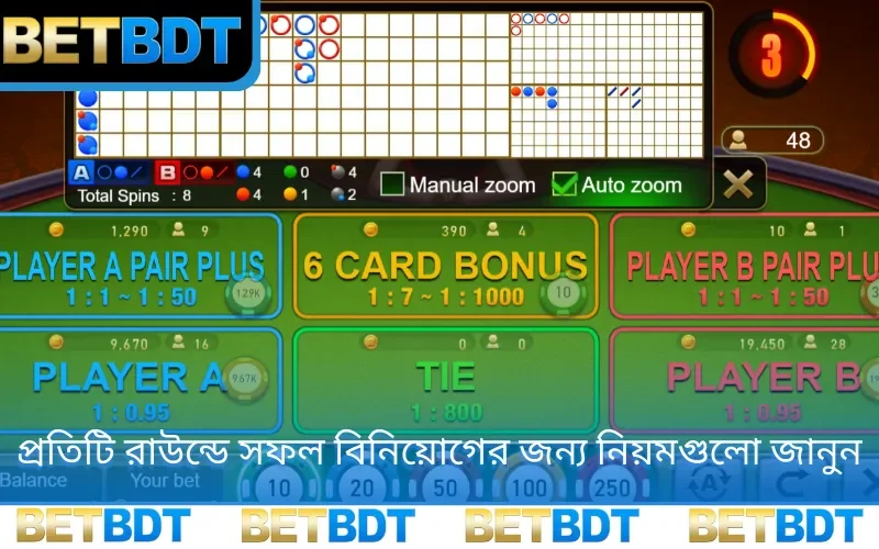 - বাজি ধরার সময়: সদস্যদের নির্ধারিত সময়ের মধ্যে টাকা বাজি ধরতে হয়। তারা এক বা একাধিক ধরণের বাজি বেছে নিতে পারেন। এর মধ্যে রয়েছে Player A, Player B, Tie (ড্র), Player A-এর Pair+, Player B-এর Pair+, এবং 6-Card Bonus.